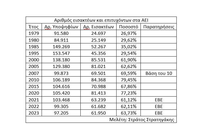 Το μόνο που πραγματικά άλλαξε είναι ο αριθμός των υποψηφίων που εισάγονται στα ΑΕΙ. Στον πίνακα βλέπουμε ότι από το 27% έως 35% των εισακτέων τη δεκαετία του 80 και του 90 πήγαμε στο 62% έως 79% από το 2000 και μετά. Διπλασιασμός του αριθμού των εισακτέων. Αυτό δεν έγινε τυχαία. Πρόκειται για απόφαση της Ευρωπαϊκής Ένωσης να αυξηθεί σημαντικά ο αριθμός των πτυχιούχων διότι οι εργαζόμενοι έπρεπε να έχουν περισσότερες γνώσεις για να αντεπεξέλθουν στη νέα εποχή. Ο στόχος της ΕΕ είναι το 40% των νέων να είναι απόφοιτοι ΑΕΙ. Αυτό τον στόχο τον έχουμε πετύχει ως χώρα με τον αριθμό των μέχρι τώρα πτυχιούχων. Μετά την εφαρμογή της Ελάχιστης Βάσης Εισαγωγής δεν γνωρίζουμε αν θα επιτευχθεί ο στόχος.